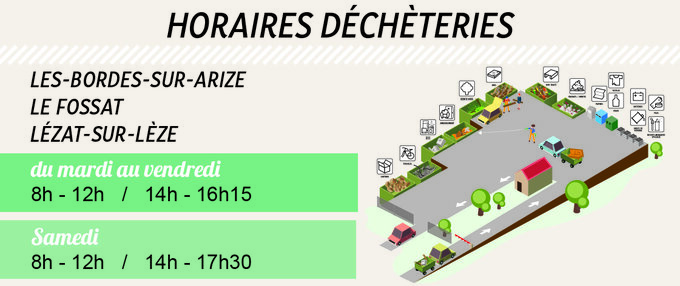 Pour votre information, des travaux de réfection complète de la déchèterie de LES BORDES SUR ARIZE se déroulent du lundi 08 novembre 2021 au samedi 19 mars 2022.