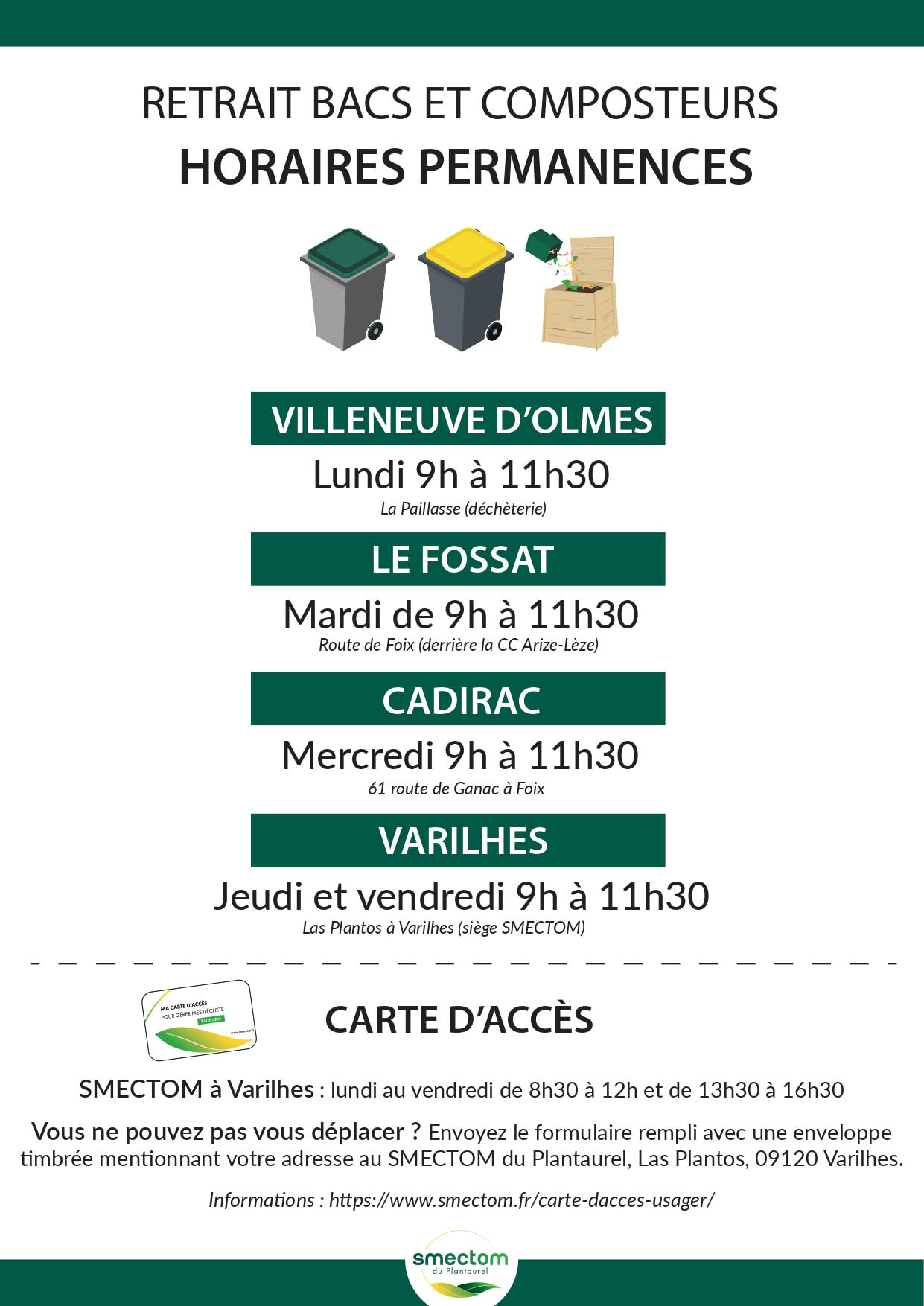• Site du SMECTOM à Varilhes (Las Plantos) : Jeudi et vendredi de 9h à 11h30