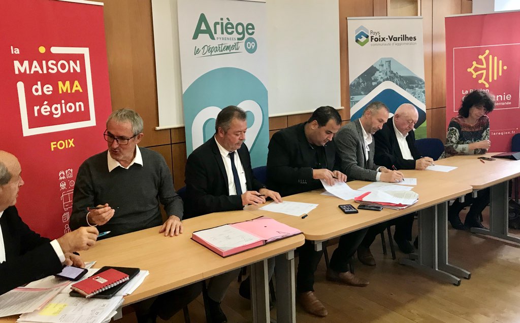 Jeudi 24 octobre, à la maison de la Région à Foix, les maires de Daumazan, Le Fossat, Lézat sur Lèze et Le Mas-d’Azil ont signé leur contrat avec Kamel Chibli, le Vice-Président de la Région Occitanie / Pyrénées-Méditerranée.